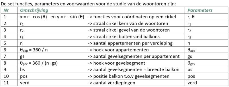 Voor de vormstudie van de woontoren is gebruik gemaakt van twee eenvoudige wiskundige goniometrische functies. Er zijn verschillende parameters benoemd, parameters die van belang zijn voor het vraagstuk. Parameters die bepalend zijn voor een vraagstuk. Deze zijn niet altijd even evident, daarom start altijd met enkele voor de hand liggende parameters en voeg later nieuwe toe. Door parameters toe te voegen neemt de complexiteit toe en deze geleidelijke aanpak resulteert in een goed overzicht.